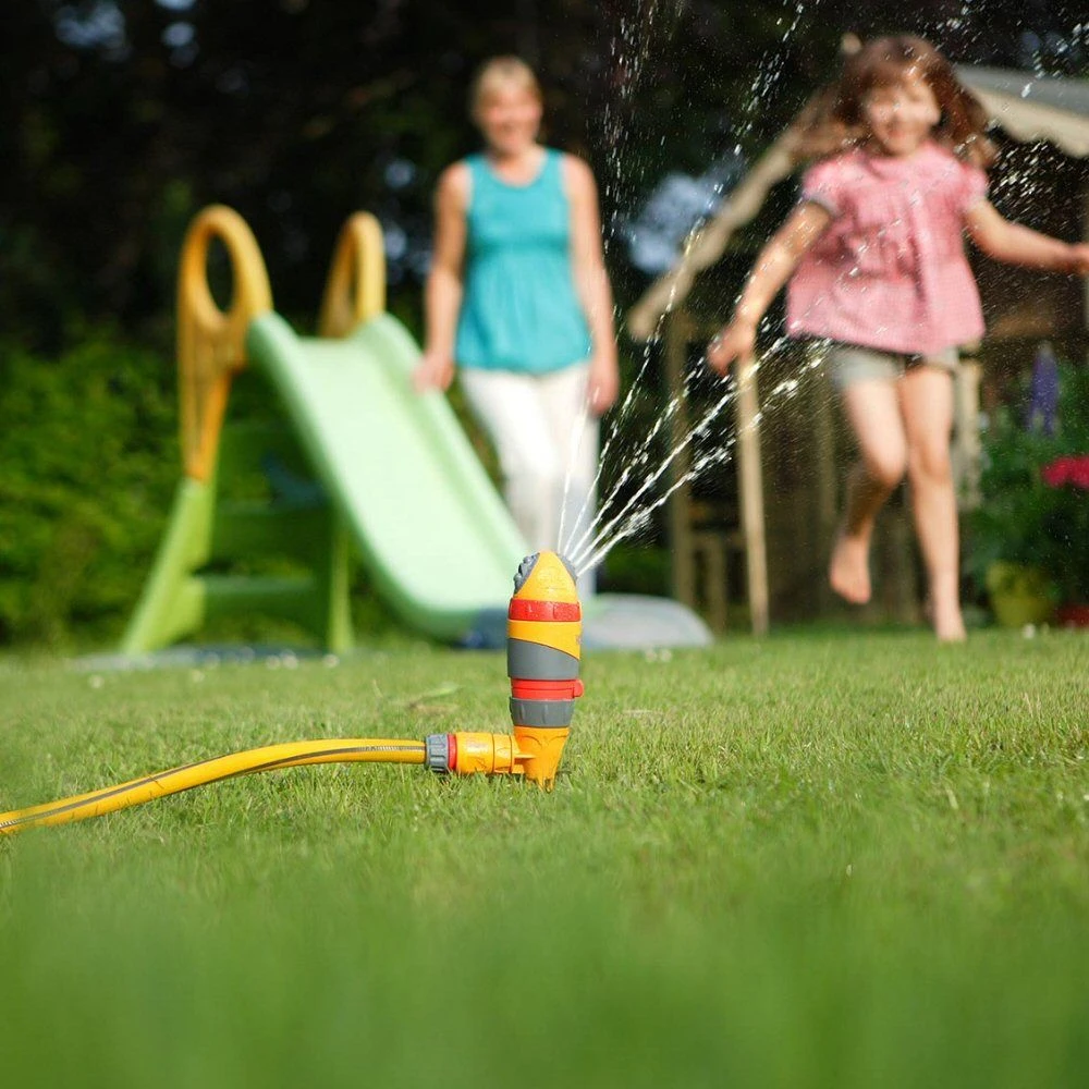 The sprinkler is mounted on a solid metal spike which gives stability when pushed into a lawn or a border. They feature an ultra-reliable, water-powered, gear drive motor that operates at all water pressures – two year guarantee.